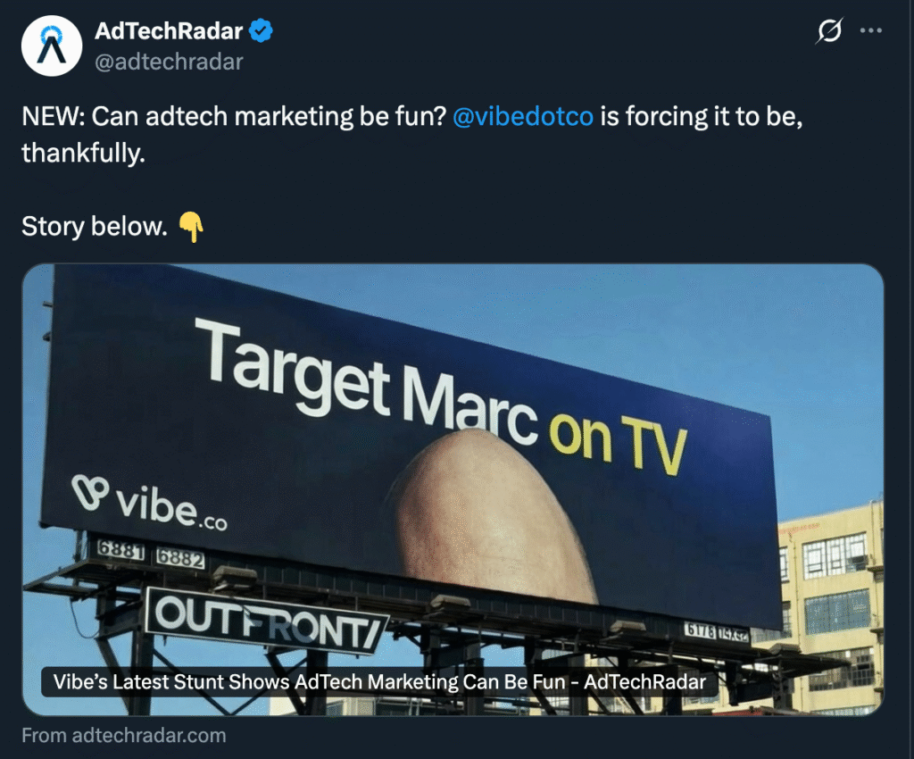 P.S. I asked Vibe.co about the costs here, and they’re illuminating: The whole campaign was roughly $120K, which gave them 4 weeks on 4 premium-placement billboards.